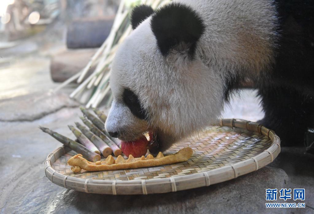 6月14日,在位于海口的海南热带野生动植物园,大熊猫“贡贡”享用美食。新华社记者 蒲晓旭 摄