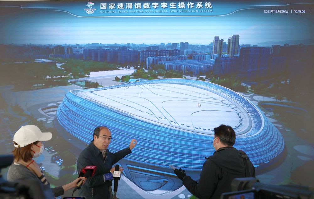图为北京国家速滑馆公司副总经理、总工程师李久林(中)在“国家速滑馆数字孪生操作系统”大屏前介绍建成智慧场馆的相关情况。新华社记者丁旭摄