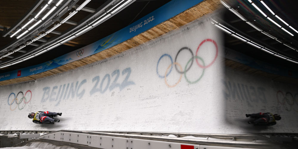 2月10日,奥地利队选手托马斯·施托伊和洛伦茨·科勒在比赛中。当日,北京2022年冬奥会雪橇项目团体接力比赛在国家雪车雪橇中心举行。新华社记者孙非摄